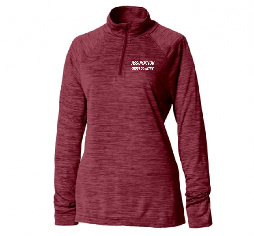 7a. Womens 1/4 Zip Pullover (moisture wicking): 100% polyester women's maroon pullover with 1 color design embroidered on left chest.