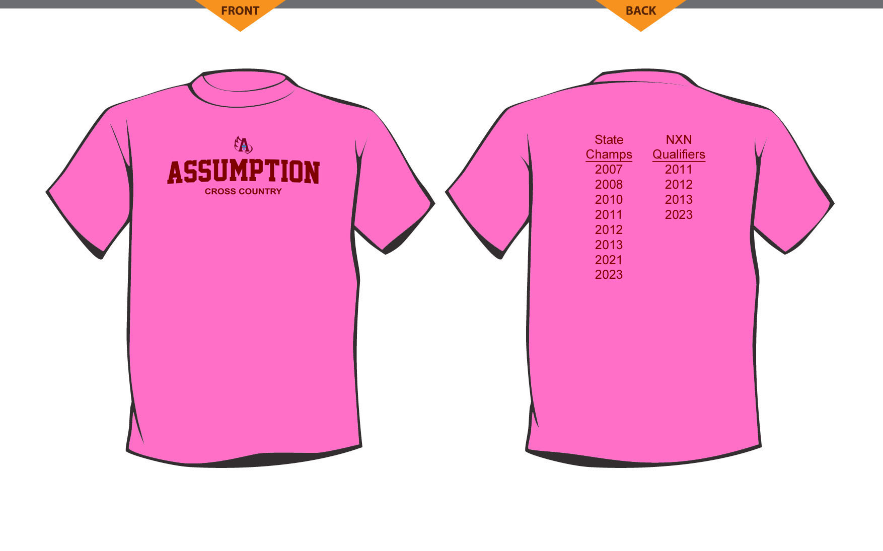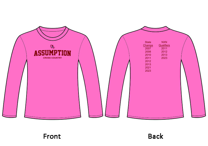 1. Women’s short sleeve moisture-wicking t-shirt: pink polyester/moisture wicking short sleeve t-shirt with a 2 color front design and 1 color back design. This shirt will also come with a long sleeve option (below).