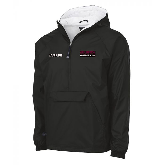 5. Quarter zip rain jacket pullover: black Charles River rain jacket with 2 color logo on left chest and 1 color logo on right chest.