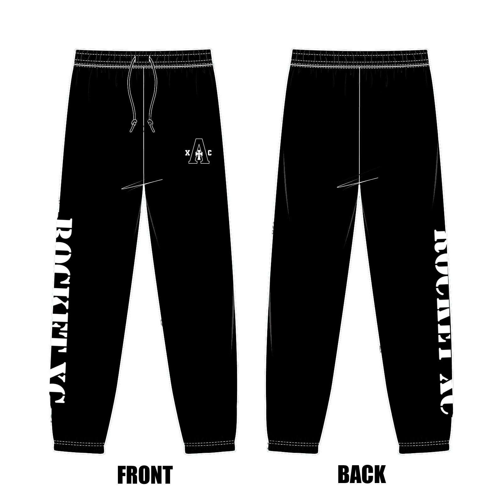 4. Sweatpants: black fleece sweatpants with 1 color logo at the top of the left leg and 1 color logo down, along the right leg.